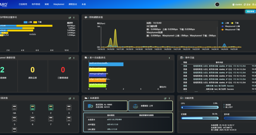 UI畫面:「AgileLink新世代廣域網路管理」提供多項重要即時資訊,快速掌握設備、系統、網路狀態。