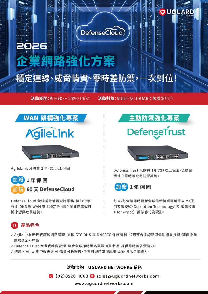 2026-03-19 台北訊息 「2026企業網路強化方案」-穩定連線、威脅情資、零時差防禦,一次到位! Defense Trust 新世代威脅情資管理平台,整合全球即時黑名單與情資來源,提供零時差防禦能力。AgileLink 新世代廣域網路管理解決方案,支援 GTC DNS 與 DNSSEC 保護機制,並可整合多線路與低軌衛星技術,確保企業連線穩定不中斷,透過 X-View 集中報表與 AI 情資分析報告,企業可即時掌握風險狀況,強化決策能力。UGUARD NETWORKS原廠特別推出針對企業的銷售活動。